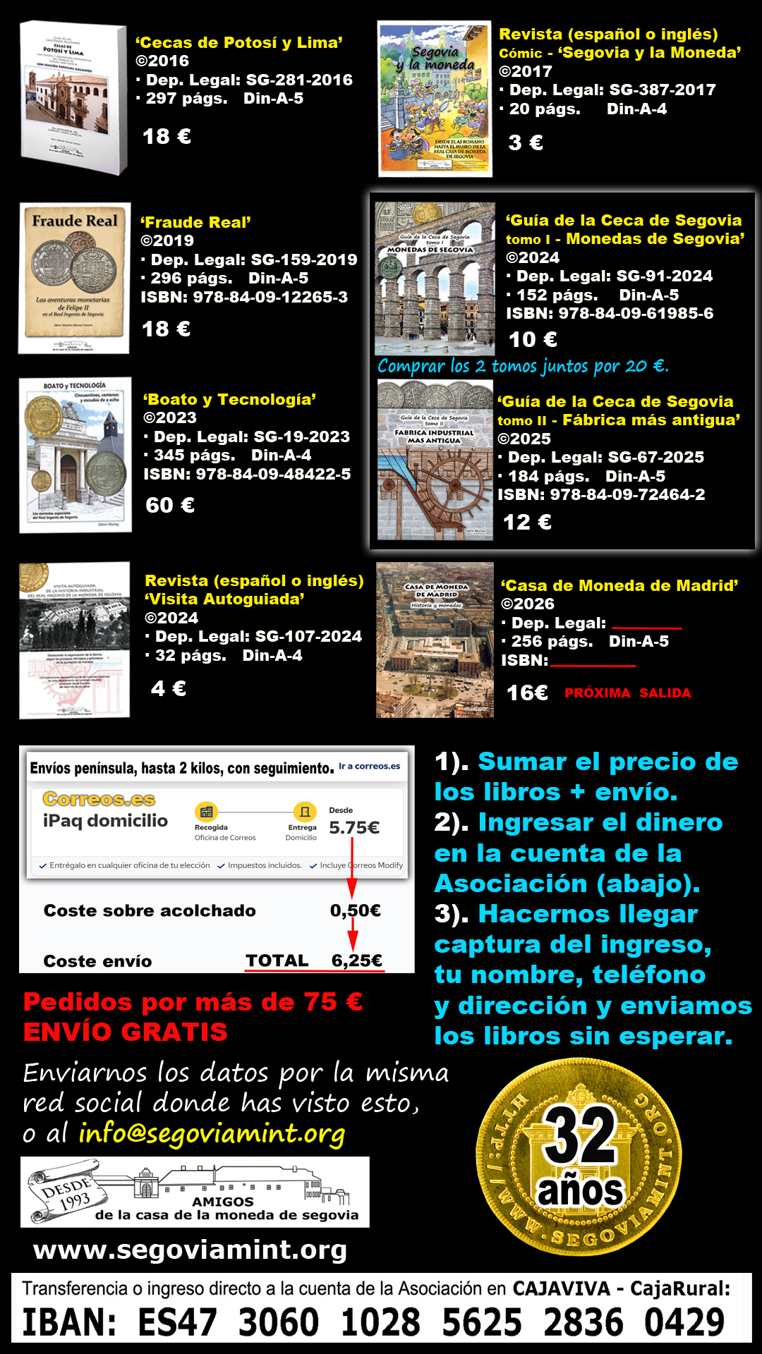 MERRY CHRISTMAS and HAPPY NEW YEAR 2025. Our books can be purchased at the Museo de la Casa de Moneda in SEGOVIA, and at the Museo Casa de Moneda F.N.M.T. in MADRID, among other places. The books are free for members who register before the publication date of each new book. 10% discount on previous books for new members. We pay shipping costs for orders over €50.
